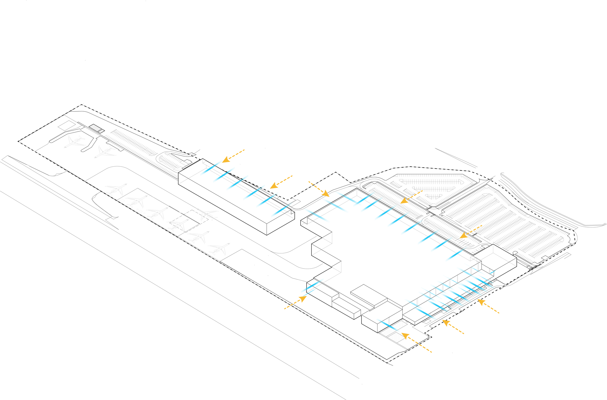 The exterior façades break away from the typical monotony of horizontal strip windows and propose a series of barcode-like vertical strips of translucent polycarbonate and complimentary ones of metal panels. The material shift to translucency is used as an intuitive wayfinding strategy. While providing ample diffused natural light to the production floor, single strip translucent panels are aligned with glass doors at exit corridors. This functional and dynamic proposal of massive spans, limited by functions of straight lines and fixed aircraft proportions, is yet designed for people.