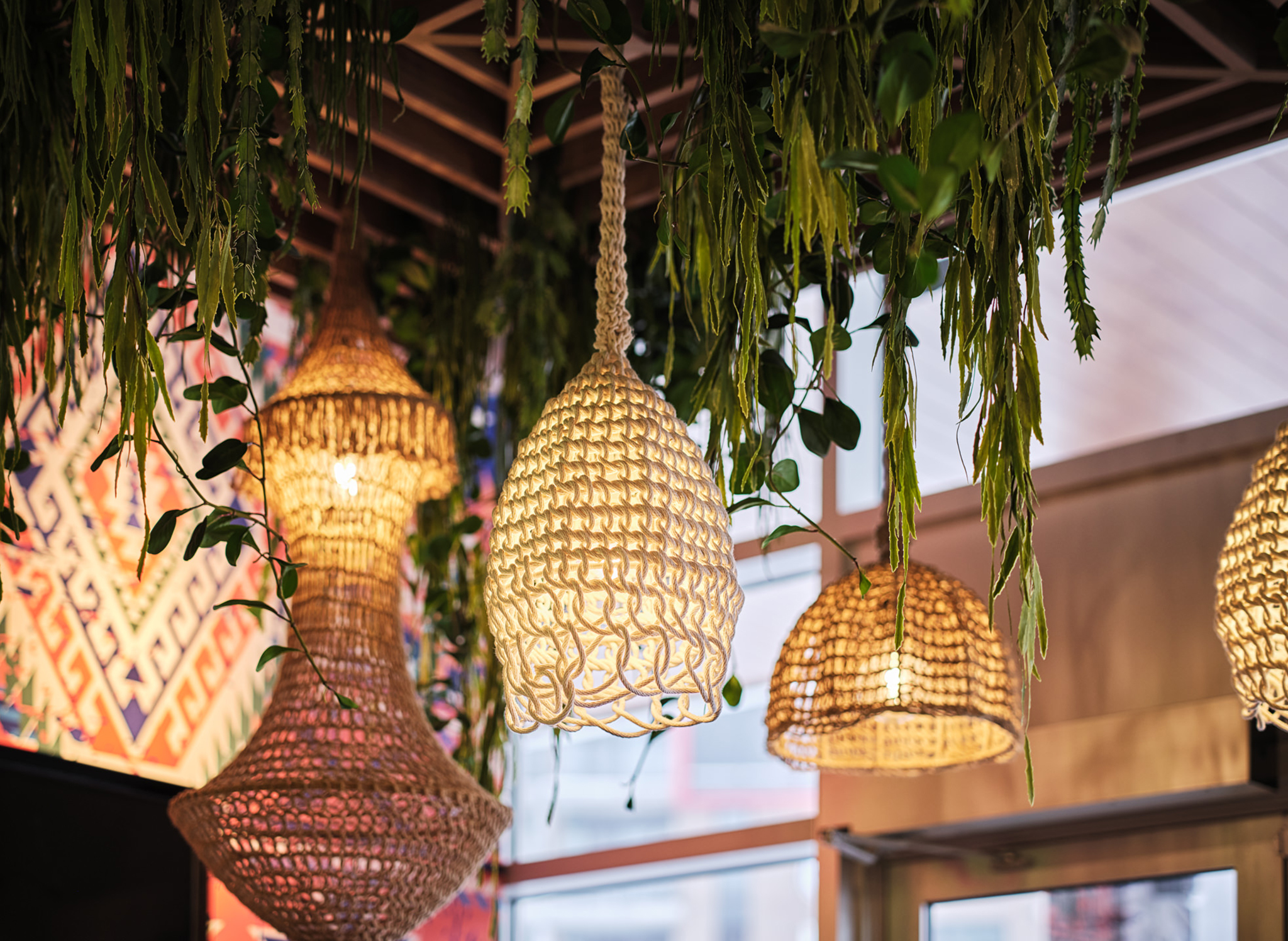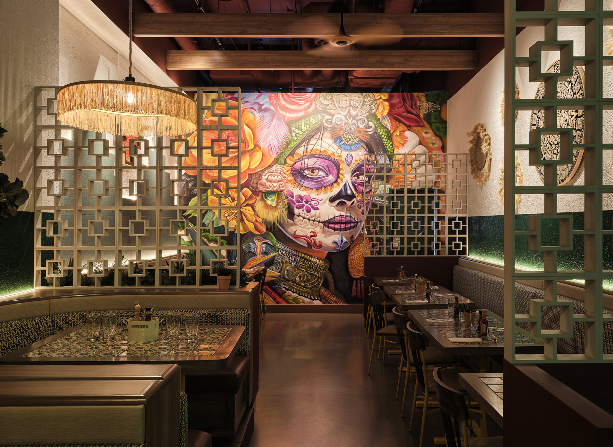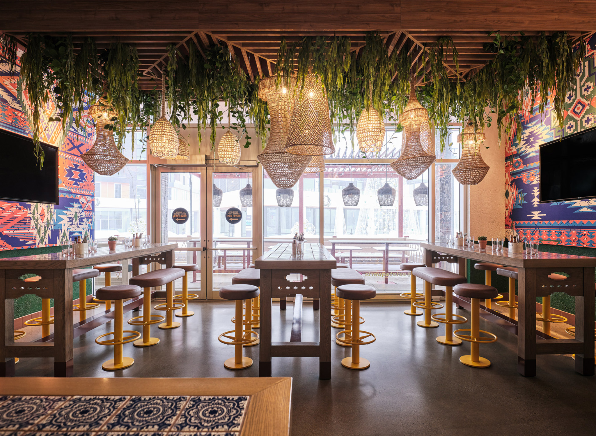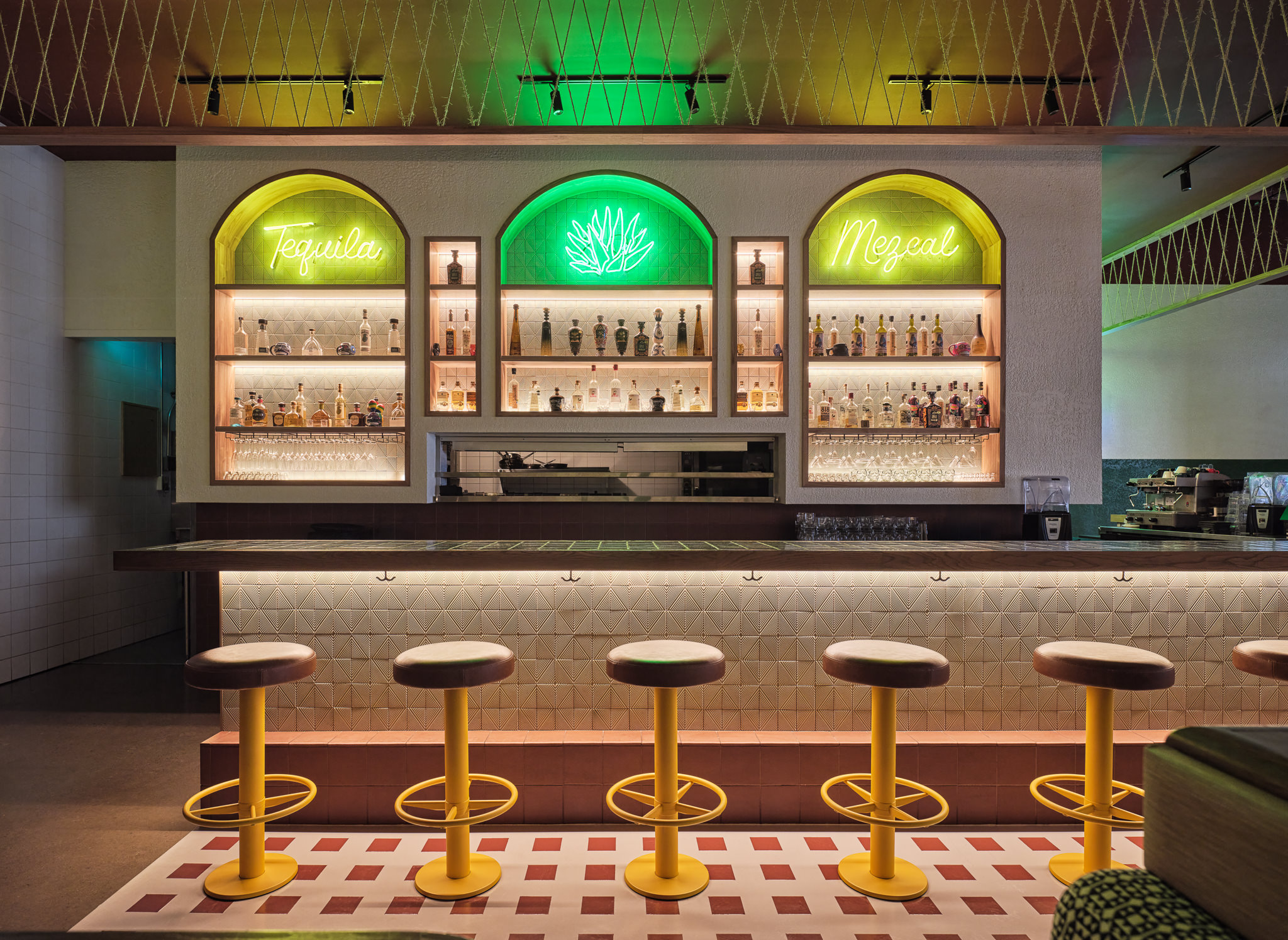 AZTA multiplie les clins d’œil à la culture mexicaine en mêlant tradition et influences contemporaines. Les enseignes au néon côtoient les poteries artisanales, créant une esthétique colorée et éclectique. Les tuiles ont été peintes à la main au Mexique. Le bois et la céramique, omniprésents, sont mis en œuvre à travers un mobilier conçu sur mesure. Des poutres ajoutées au plafond réduisent l’impression de hauteur et accentuent l’intimité du lieu.