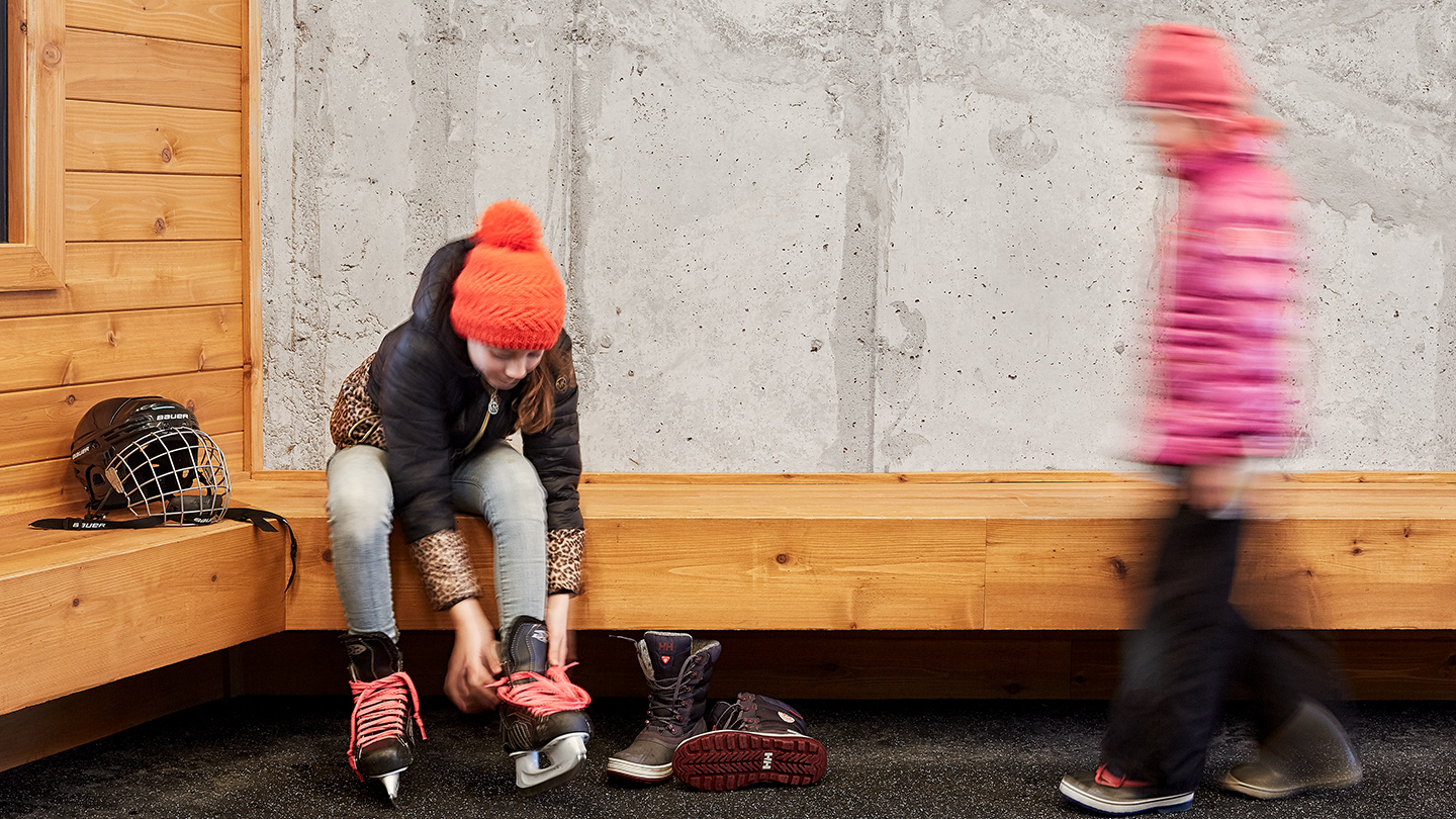 Directement connecté au pavillon, un terrain de sport change d’usage au fil des saisons : patinoire de hockey durant l’hiver, il devient terrain de basket durant l’été. Avant tout destinés aux enfants du quartier, les équipements sont également mis à disposition de la collectivité pour ses diverses activités sportives et culturelles.